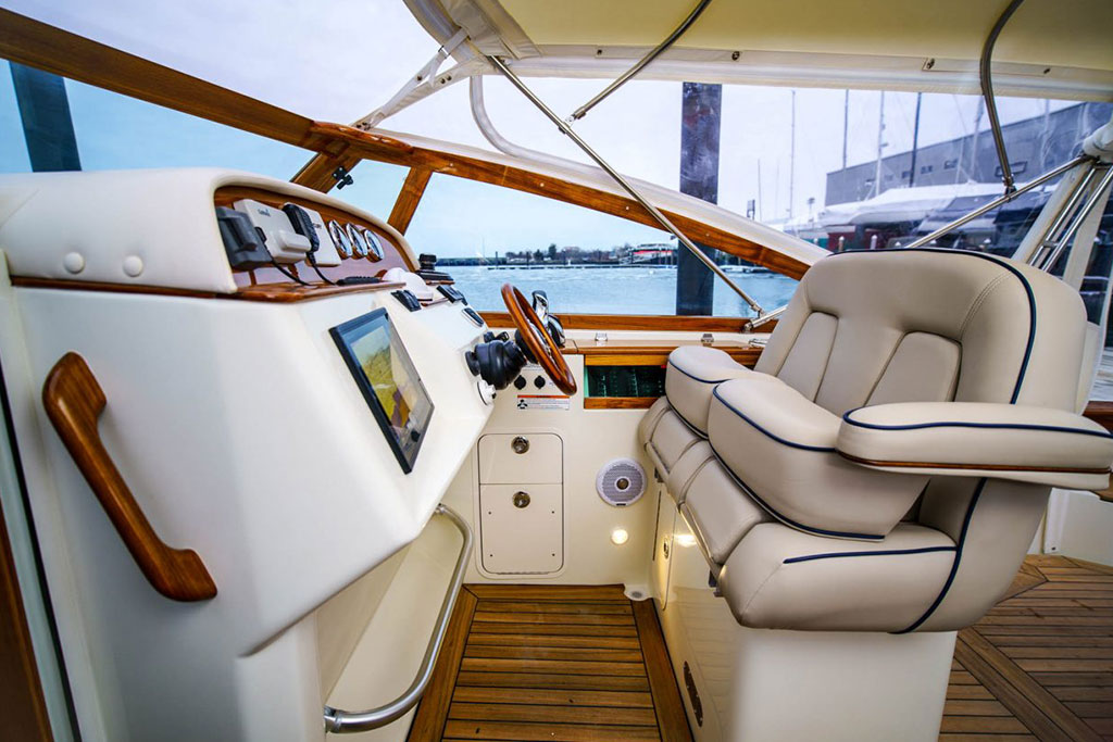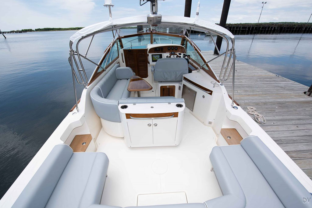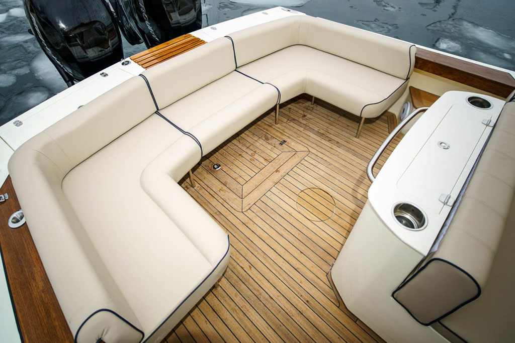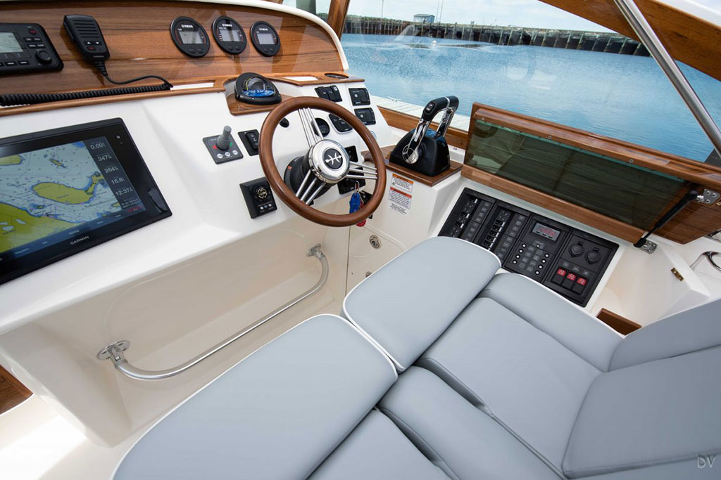 The signature Hunt Deep-V hull navigates choppy waters with ease, while twin outboard engines deliver speeds up to 44 knots. The Harrier 32 also boasts a comfy interior complete with roomy storage lockers and an enclosed head with a shower. Other convenient touches include a well-situated on-deck galley and a spacious cockpit with easy access to controls and electronics.