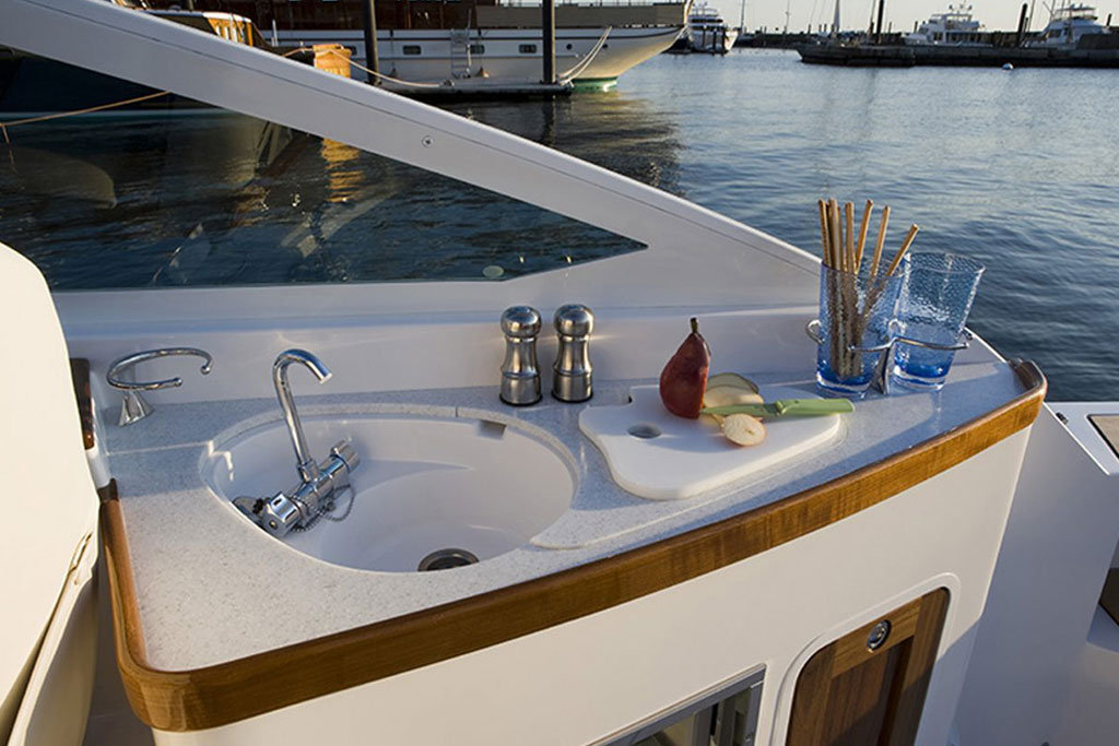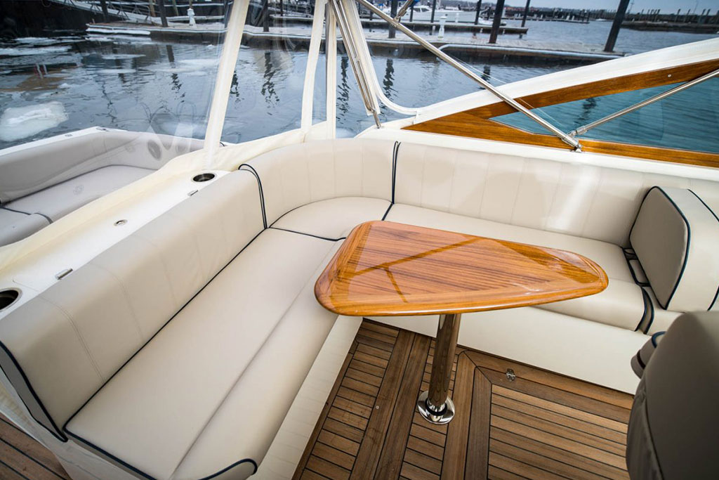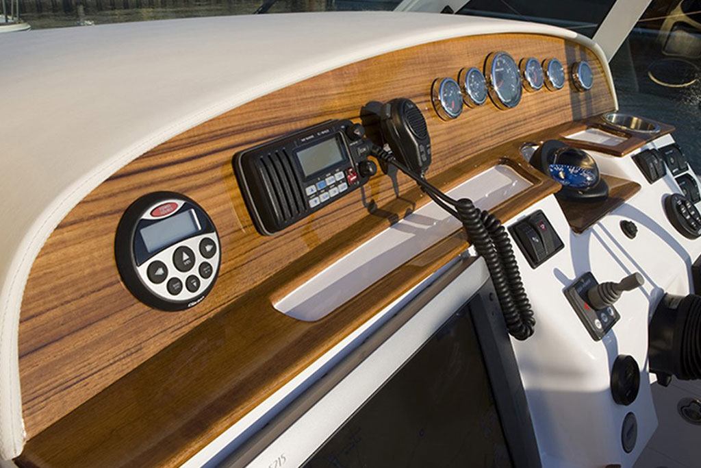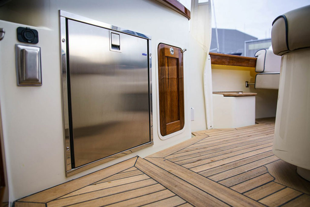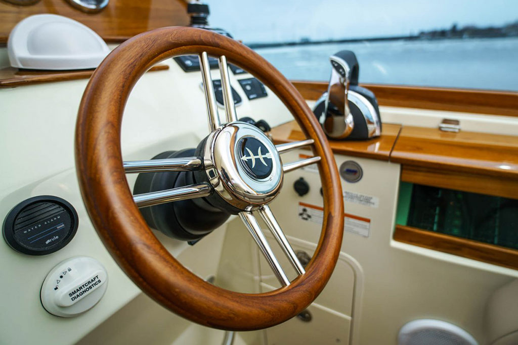 The signature Hunt Deep-V hull navigates choppy waters with ease, while twin outboard engines deliver speeds up to 44 knots. The Harrier 32 also boasts a comfy interior complete with roomy storage lockers and an enclosed head with a shower. Other convenient touches include a well-situated on-deck galley and a spacious cockpit with easy access to controls and electronics.