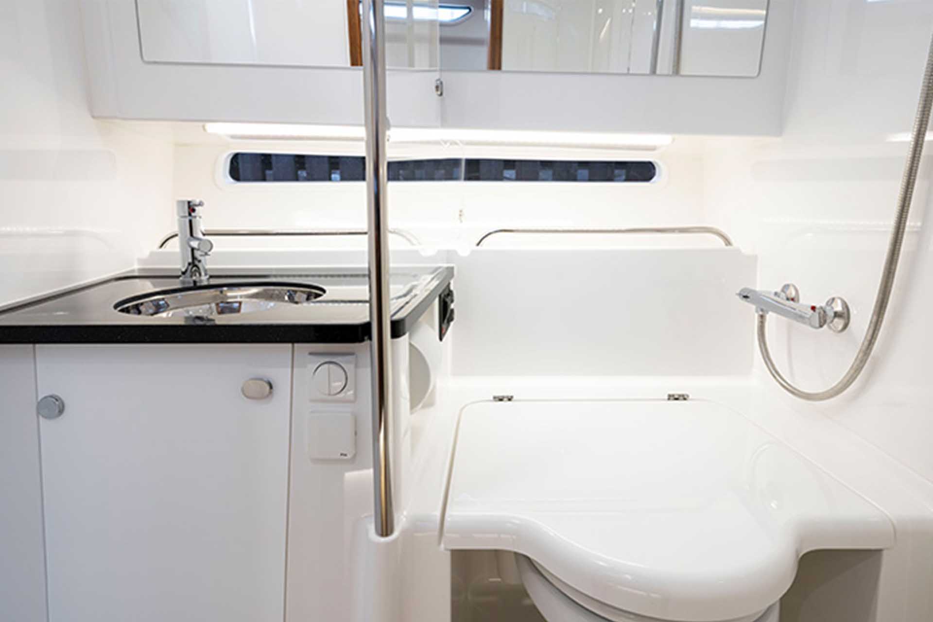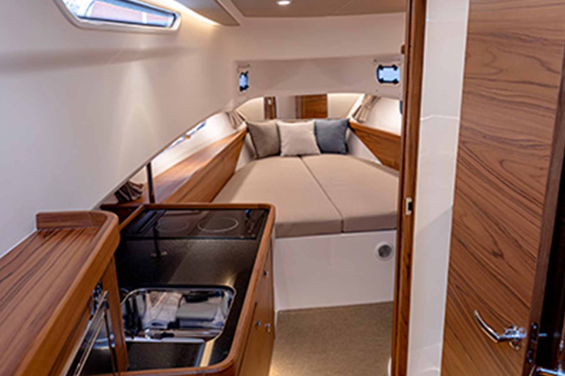With a speed of 20 to 40 knots and an inboard range of nearly 300 nautical miles, the Nimbus C11 is a powerful and versatile boat. The balanced twin stepped hull, featuring a sharp bow and a low planning threshold, also handles rough waters with ease. To complete your vessel, opt for a joystick-controlled dynamic positioning and docking system, air conditioning, suspension seating, and solar panels.